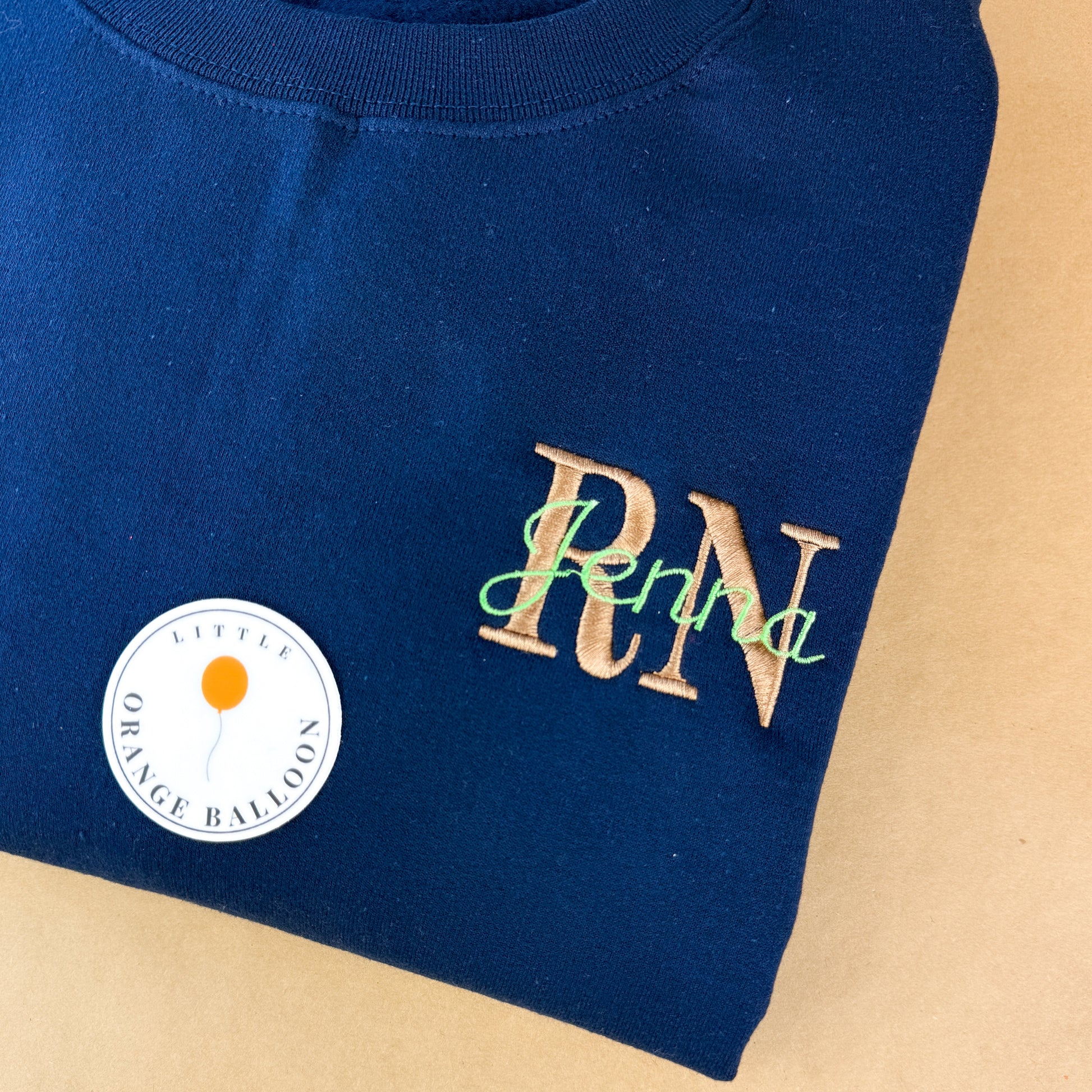 For example: RN -Gold Thread Jenna -in Lime Green Thread